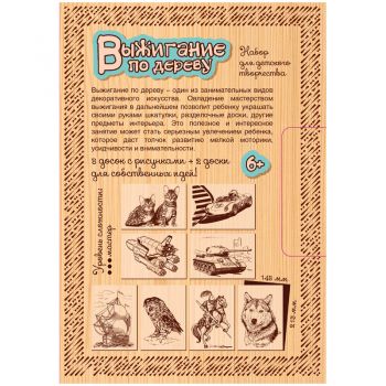 Доски для выжигания по дереву изготовлены из качественной фанеры, а трафареты рисунков выполнены специальной немецкой краской, не выделяющей в процессе горения вредных веществ. В наборе 10 досок, 8 с рисунками и 2 доски для собственных идей. Набор досок "Мастер" рекомендован для тех, кто уже хорошо освоил технику выжигания.