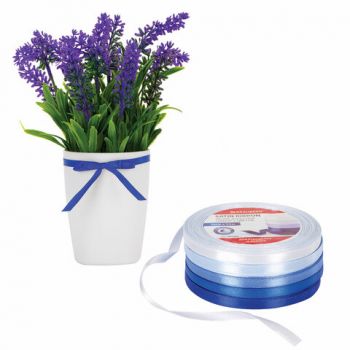 Изделие представляет собой набор из атласных лент, изготовленных из 100% полиэстера, с ткаными кромками на обоих краях. Кромка на краях лент выполнена с применением полиэстеровой нити. Ленты изготовлены с применением саржевого способа переплетения нитей. В набор входит 5 лент голубых и синих оттенков от светло-голубого до насыщенного синего цвета шириной 6 мм (± 3%) и длиной 23 м. Каждая лента намотана на втулку из пенополистирола. Набор лент упакован в термоусадочную пленку, содержащую этикетку с краткой информацией о товаре.